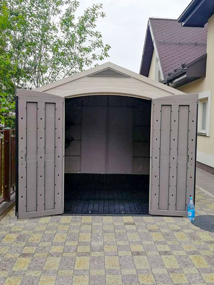 Отличное решение для хренения большого колличества садовых инструментов и дополнительной садовой техники. Так-же отлично подходит для использования в качестве бытовки и укрытия уличных небольших коммуникаций.