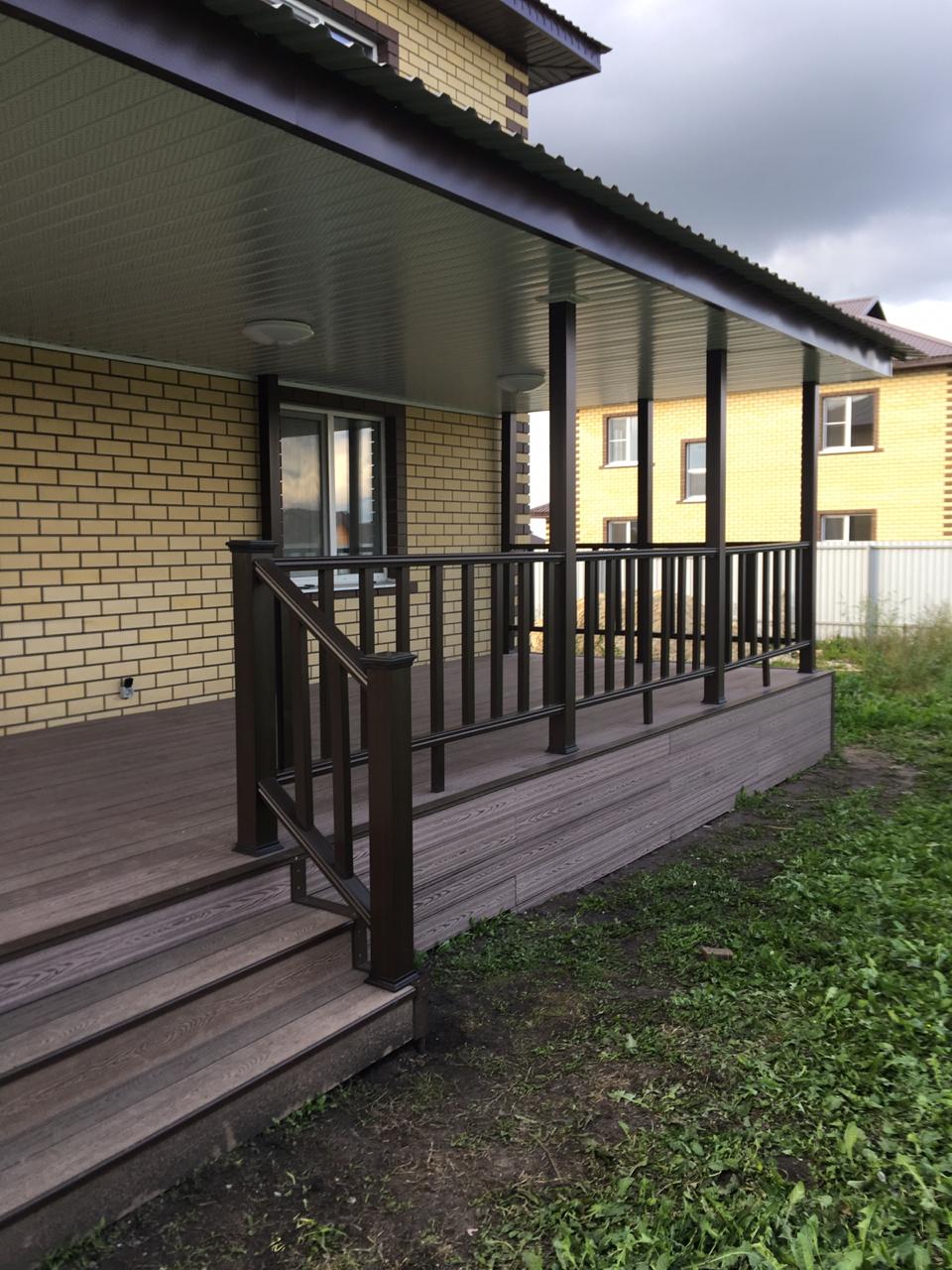 Ограждения и перила лесенки также марки Holzhof. Особенностью монтажа ограждений из ДПК Holzhof стало то, что трехметровый профиль был надет на металлические столбы-опоры прямо до потолка крыши, что придало всем ограждениям единый стиль цвета венге и органично вписалось в архитектуру дома.